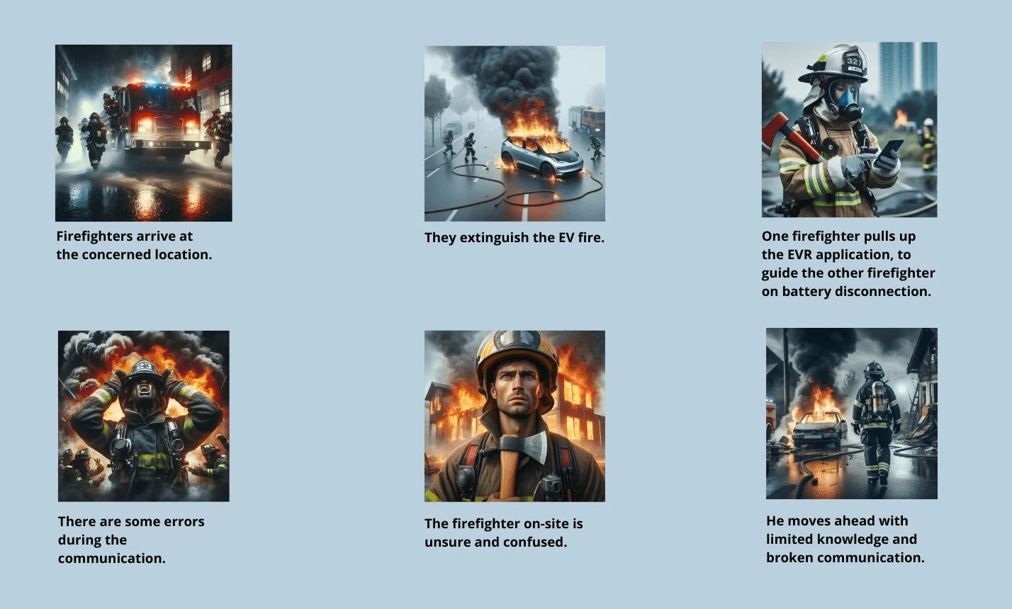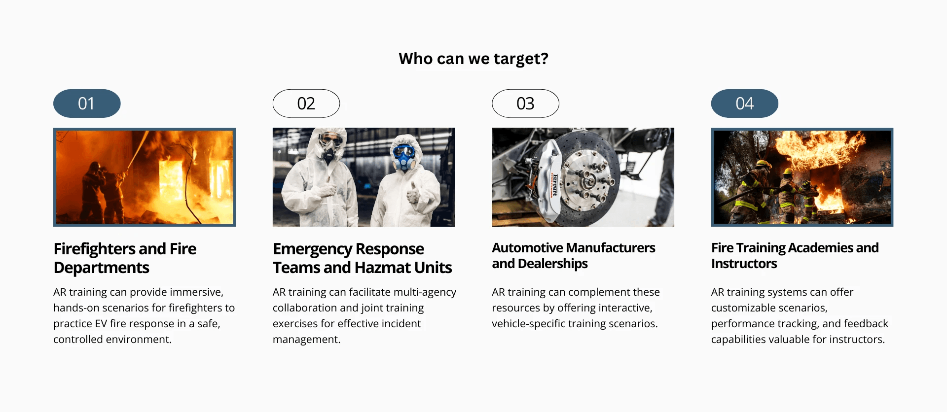 Our desk research showed us that there is a serious training gap for firefighters to tackle EV fires and that AR can be a potential technological intervention in the training space. Upon finishing our desk research we identified our users who will be directly and indirectly impacted by our solution.