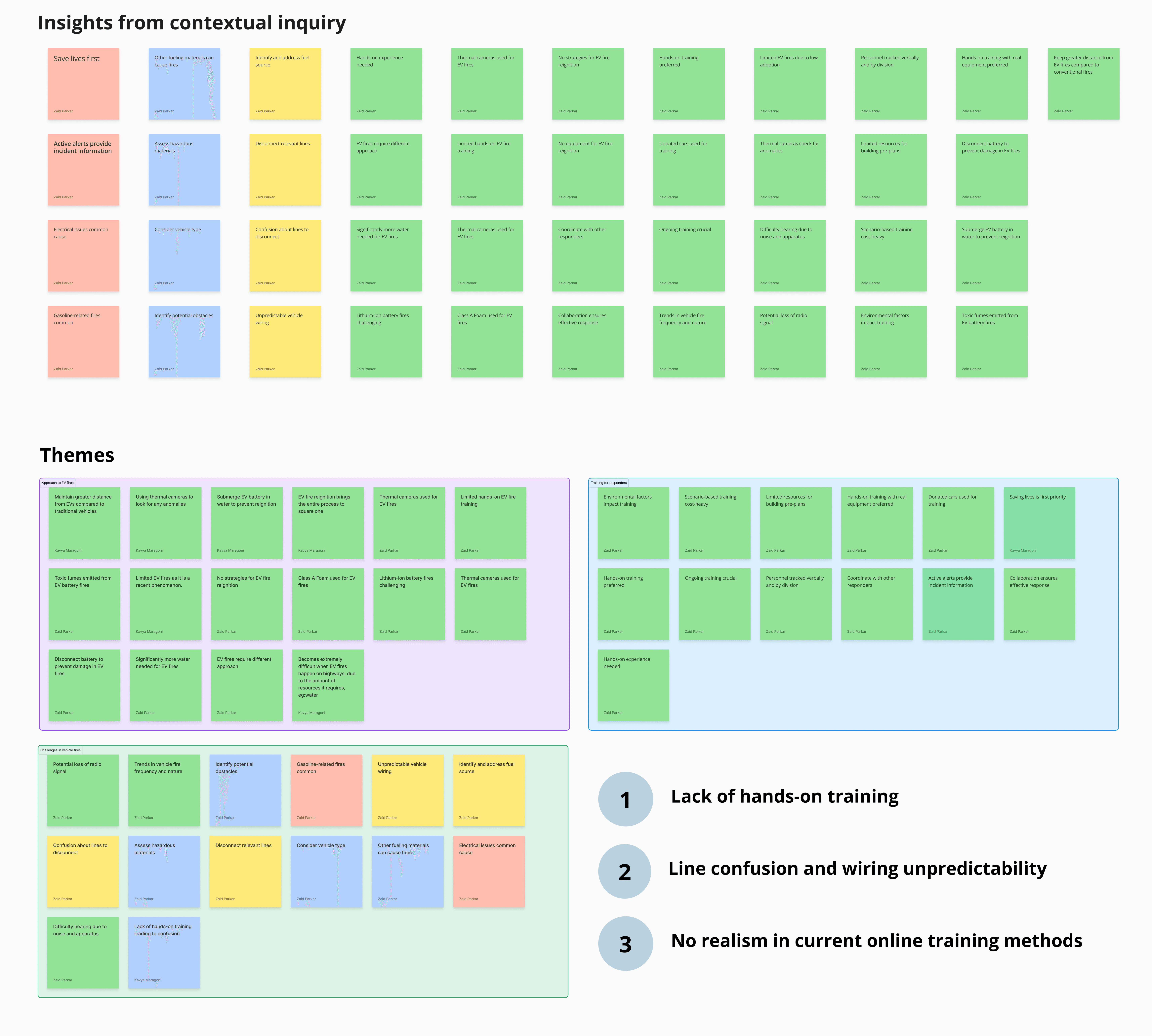 Upon deciding. our target users, I designed a phenomenological study, in which we prioritized understanding firefighters' experience with EV fires and vehicle fires in general. As part of the study, I went on a field visit to the Greenwood Fire Department to directly interact with and observe firefighters, their tools, and their practices.