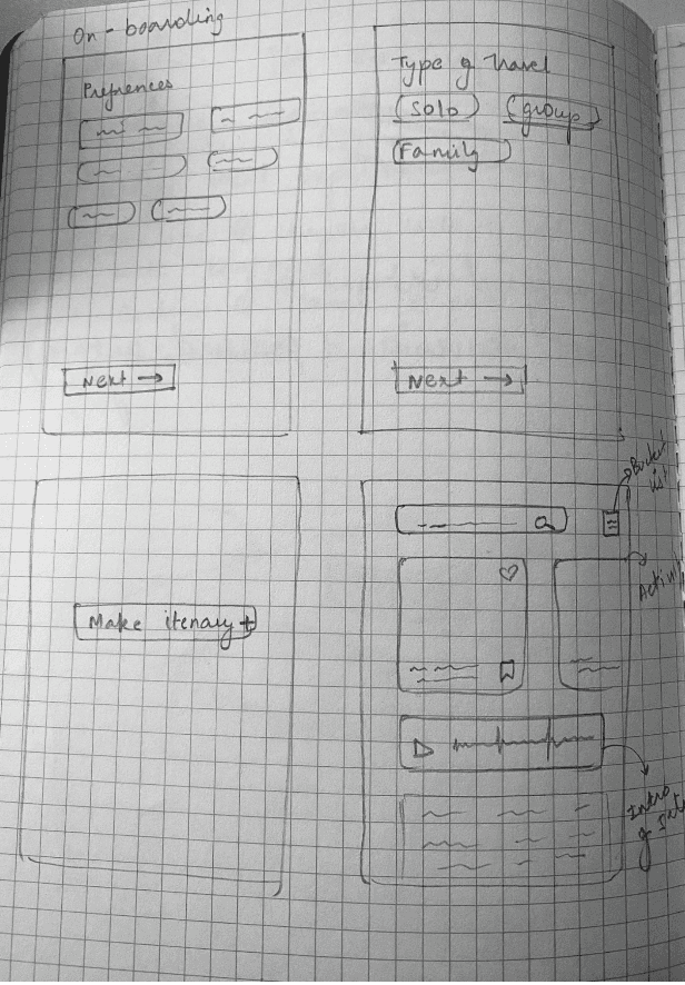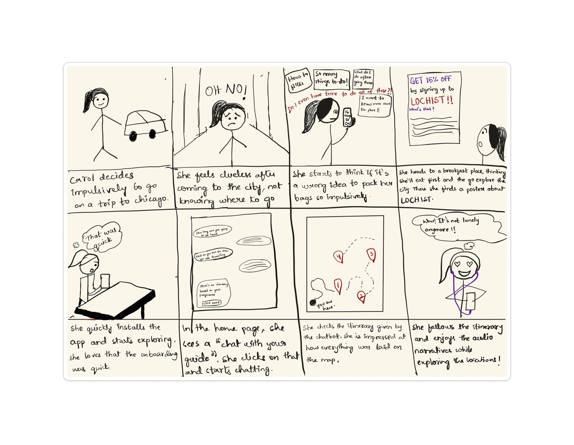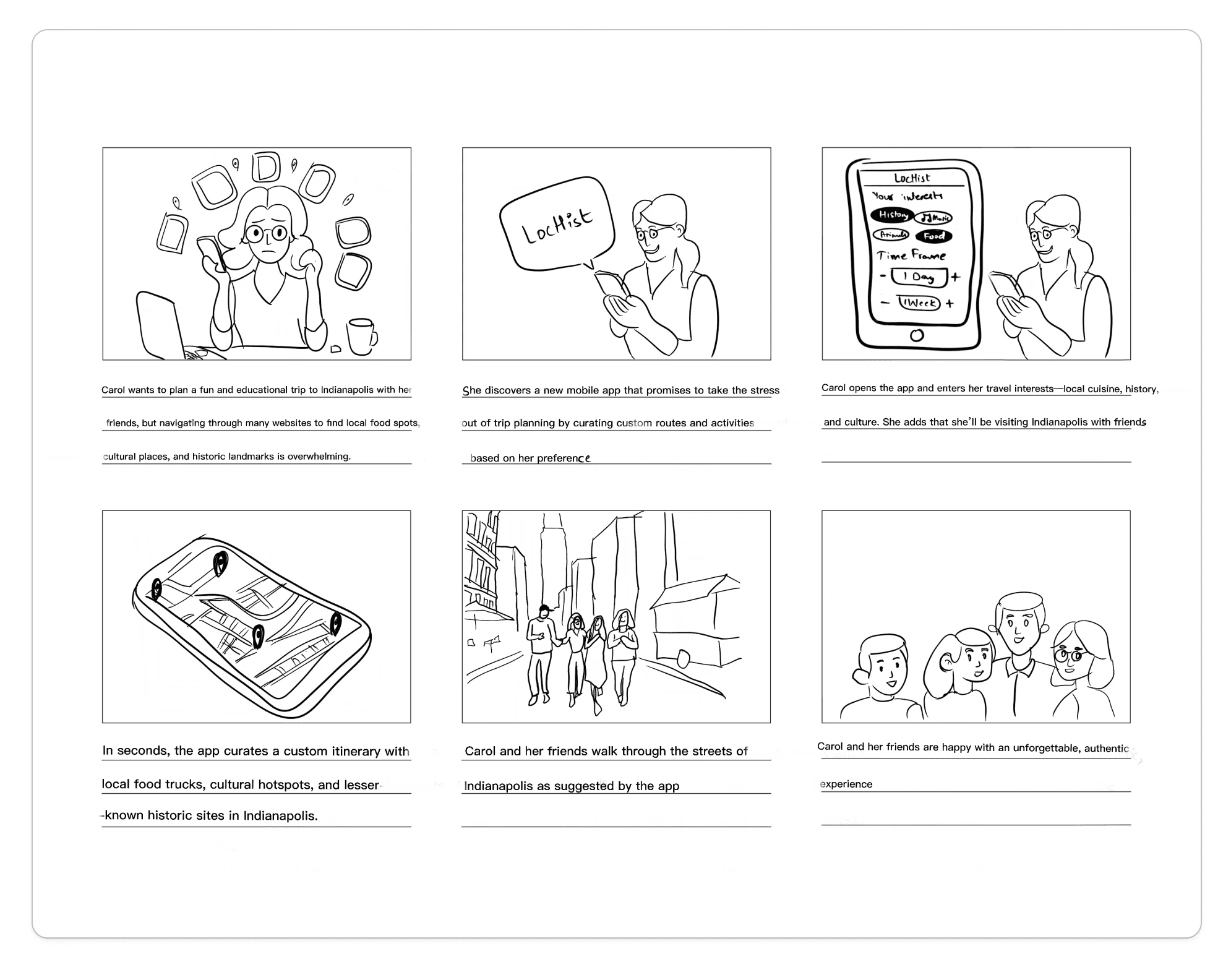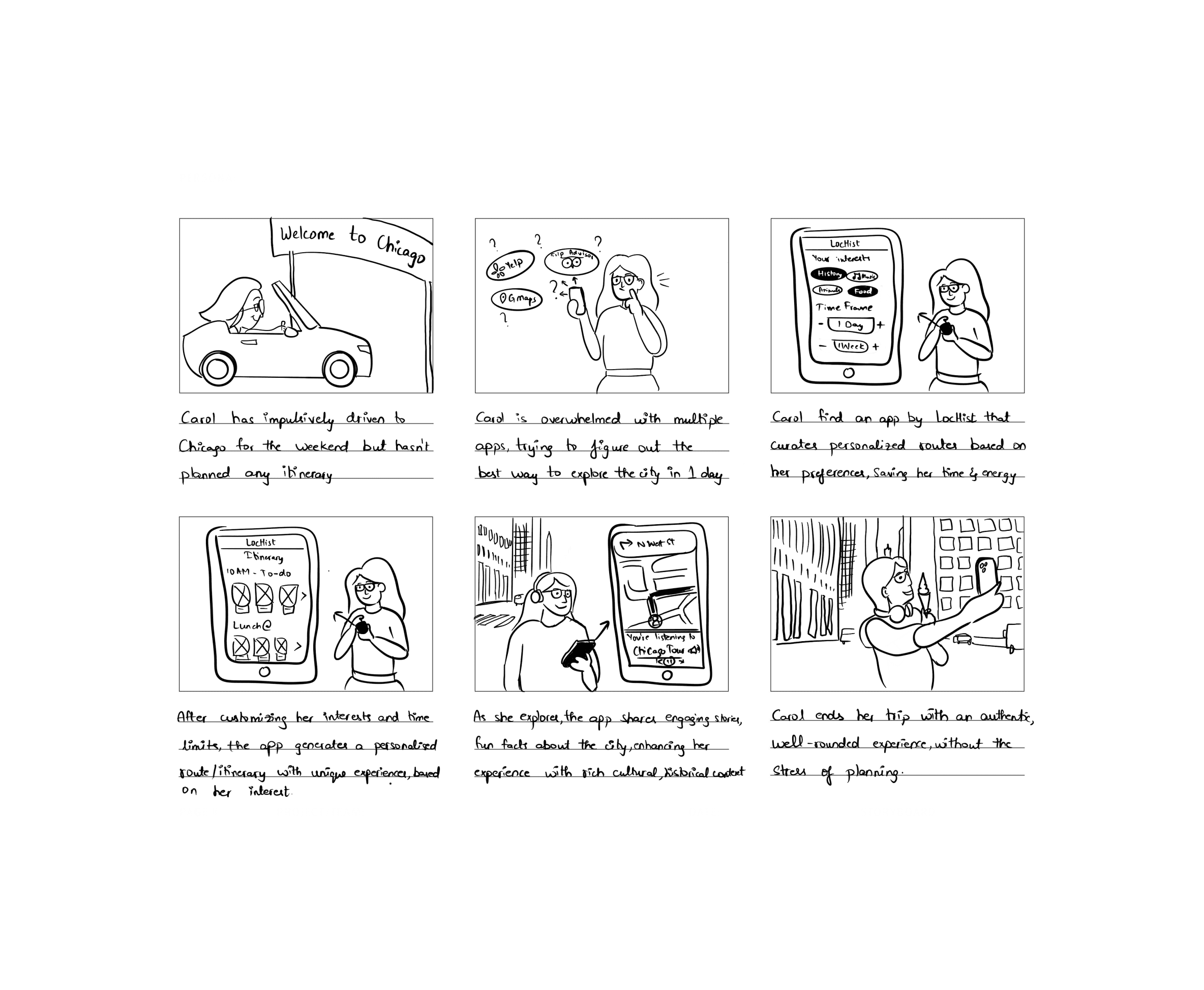 We created storyboards depicting both planned and unplanned trips, as well as experiences for solo travelers and group travelers.