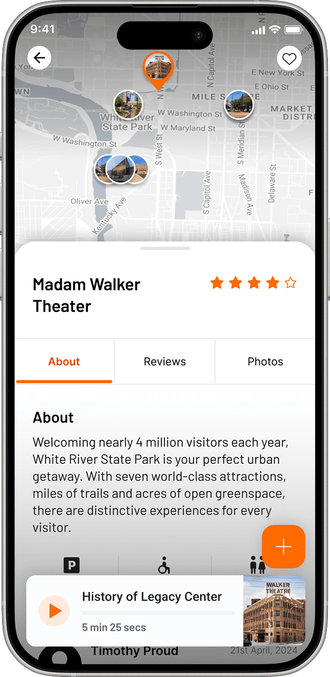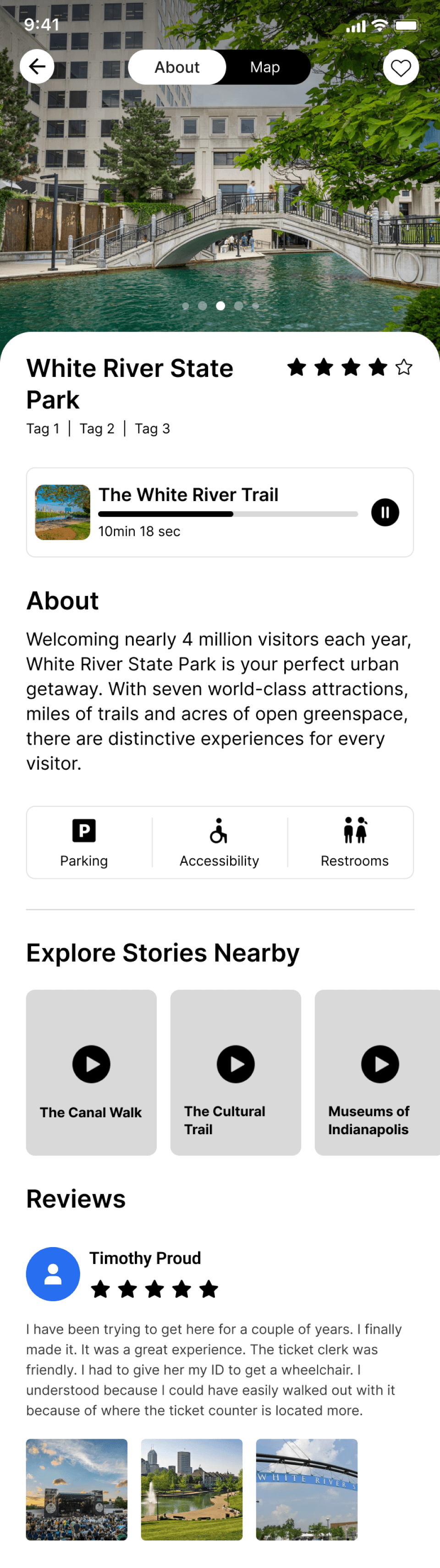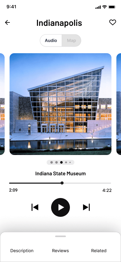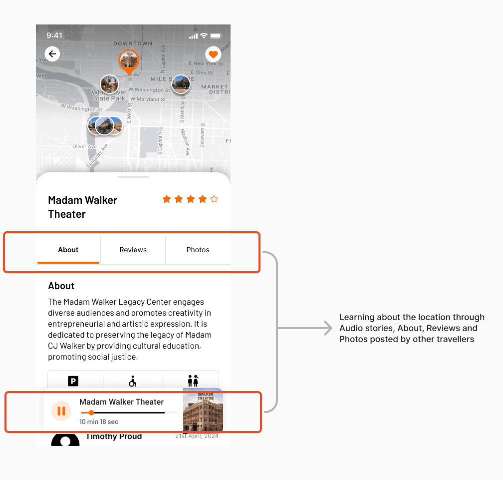 The app offers mutliple ways of learning to the user about a location through Audio stories, About, Photos, Reviews from fellow users in the community.